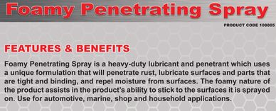 Foamy Penetrating Spray is a heavy-duty lubricant and penetrant which uses a unique formulation that will penetrate rust, lubricate surfaces and parts that are tight and binding, and repel moisture from surfaces. The foamy nature of the product assists in the product’s ability to stick to the surfaces it is sprayed on.